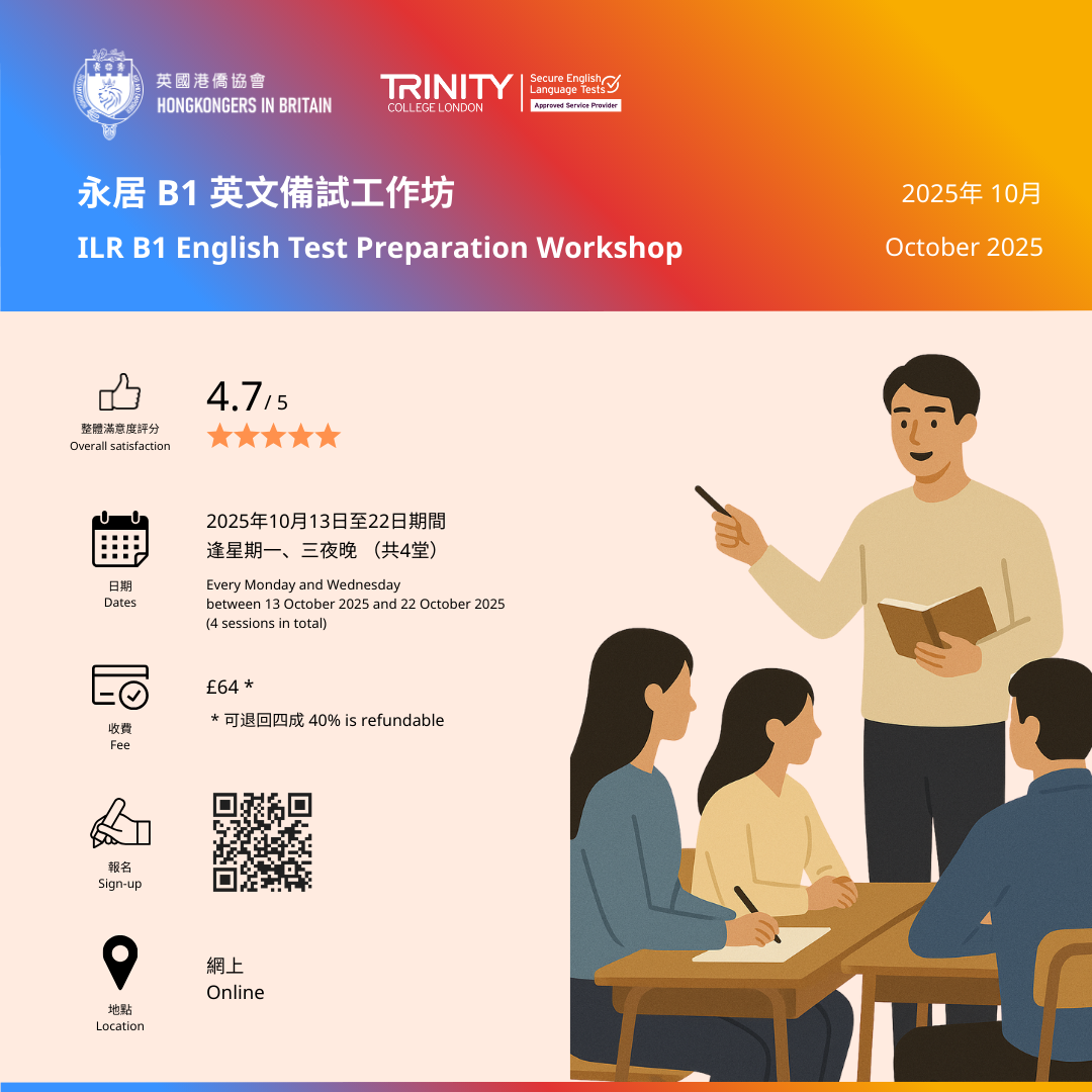 As you near your fifth year on your BN(O) visa, the B1 English language test can feel like a significant hurdle. Hongkongers in Britain (HKB) offers an interactive workshop to build your confidence and equip you with the necessary vocabulary, grammar, and skills for success.