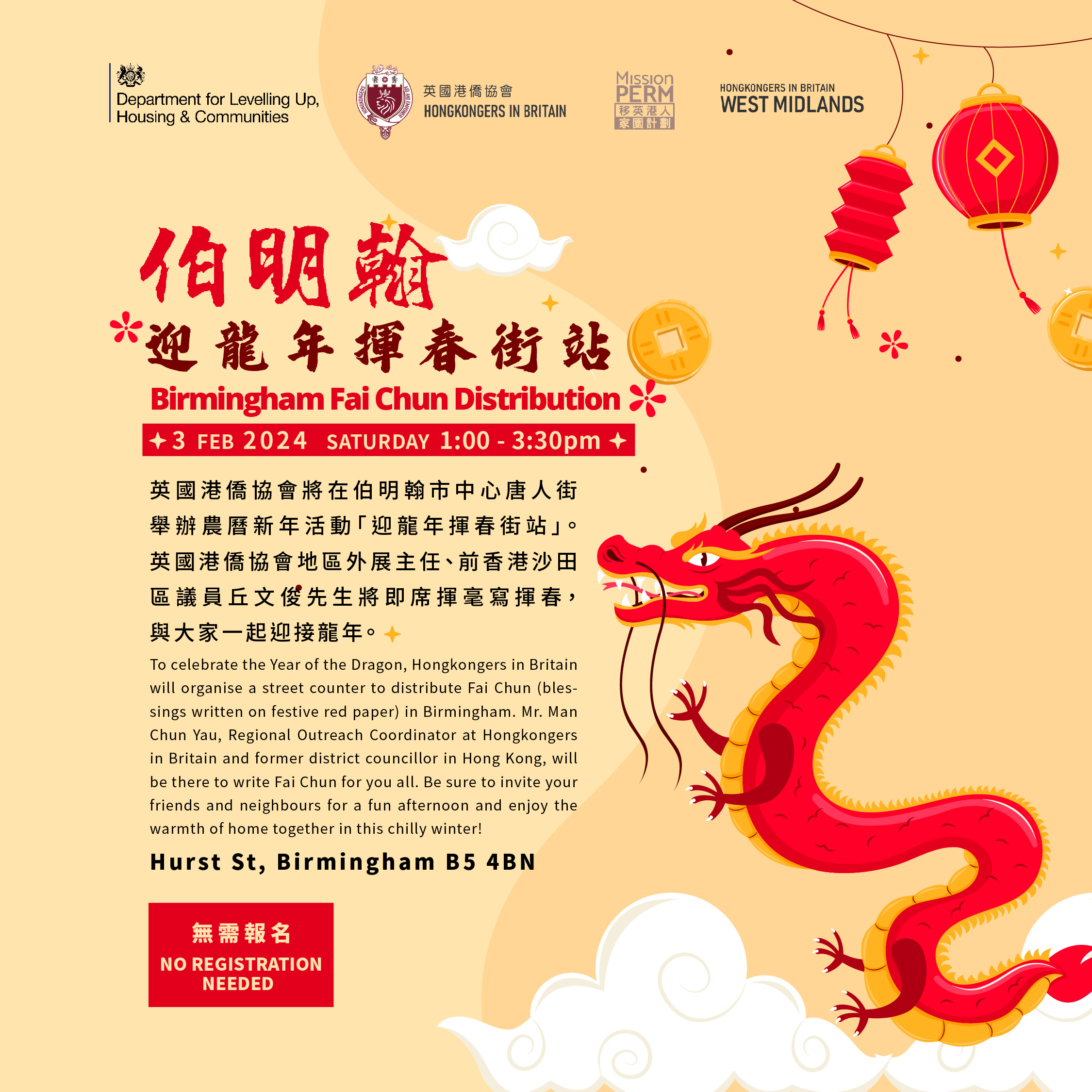 To celebrate the Year of the Dragon, Hongkongers in Britain will organise a street counter to distribute Fai Chun (blessings written on festive red paper) in Birmingham. Mr. Man Chun Yau, Regional Outreach Coordinator at Hongkongers in Britain and former district councillor in Hong Kong, will be there to write Fai Chun for you all. Be sure to invite your friends and neighbours for a fun afternoon and enjoy the warmth of home together in this chilly winter!